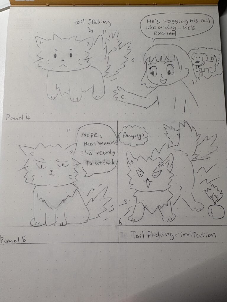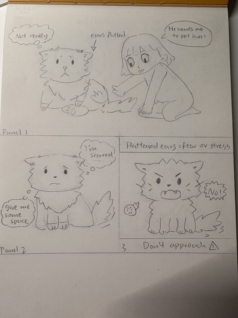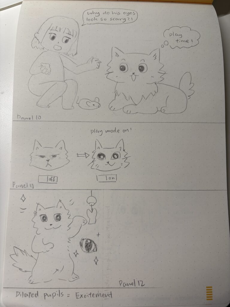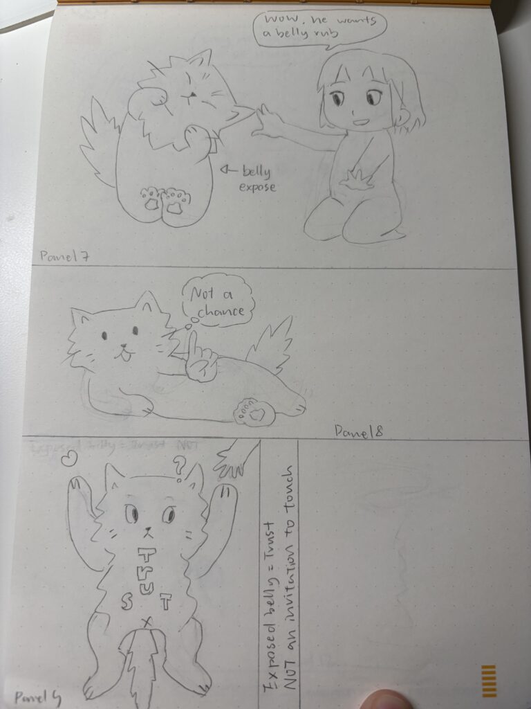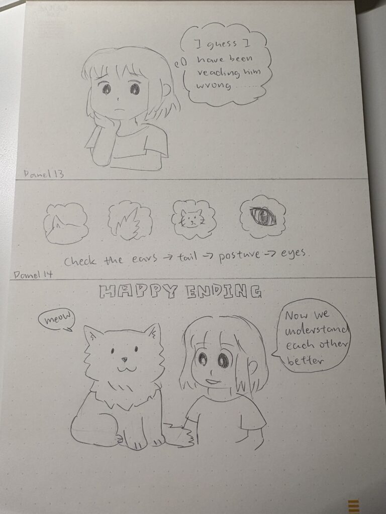 One aspect that worked particularly well in this project was the overall clarity of the storyline. The sequence of misinterpretation followed by correction gave the comic a natural rhythm that was easy for readers to follow. The use of the cat’s inner thoughts added humor and personality, which made the comic more engaging for children and new pet owners. The consistent focus on four specific signals, which were ears back, tail flicking, belly showing, and pupil dilation, helped keep the learning objectives clear throughout.